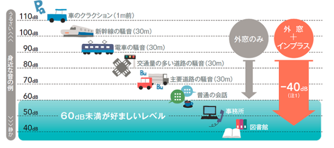 たとえば、80dBの騒音が40dBに抑えられれば、交通音が図書館レベルの静けさに近づきます。