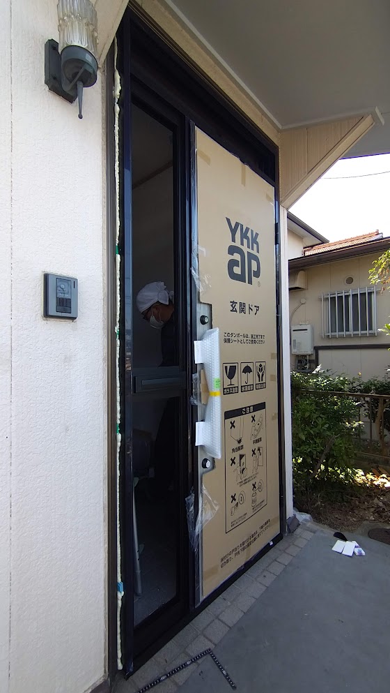 枠の取り付けが完了し、玄関ドア本体を吊り込みます。