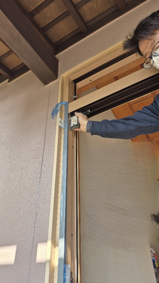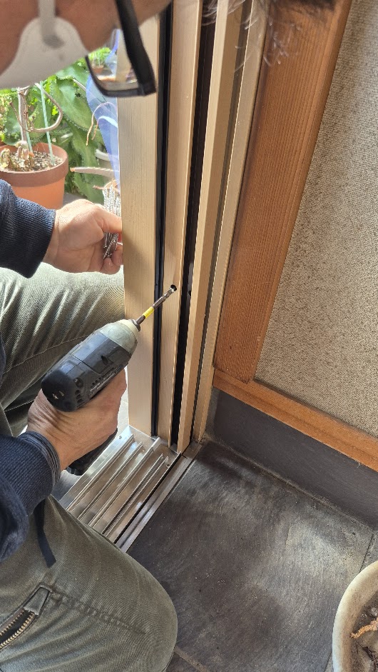 一か所づつ、古い枠の奥にある躯体へ長いビスを打ち込みます。