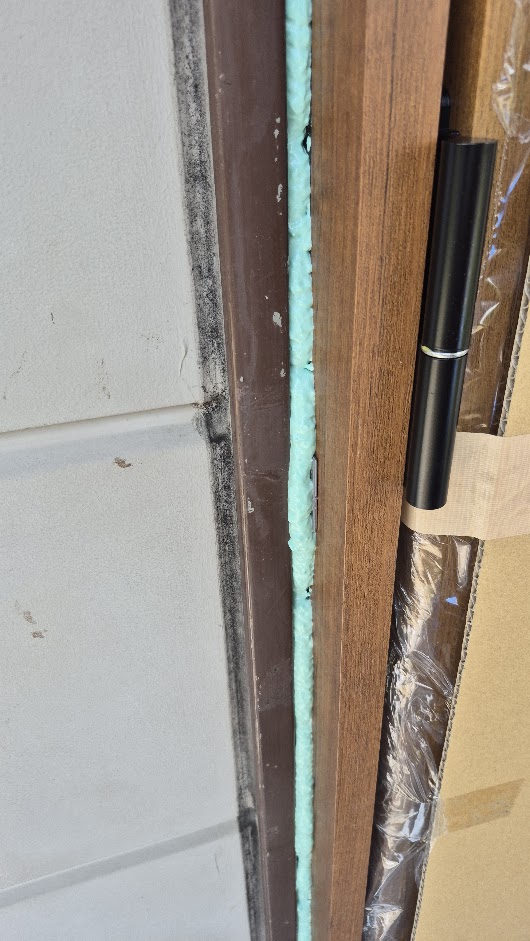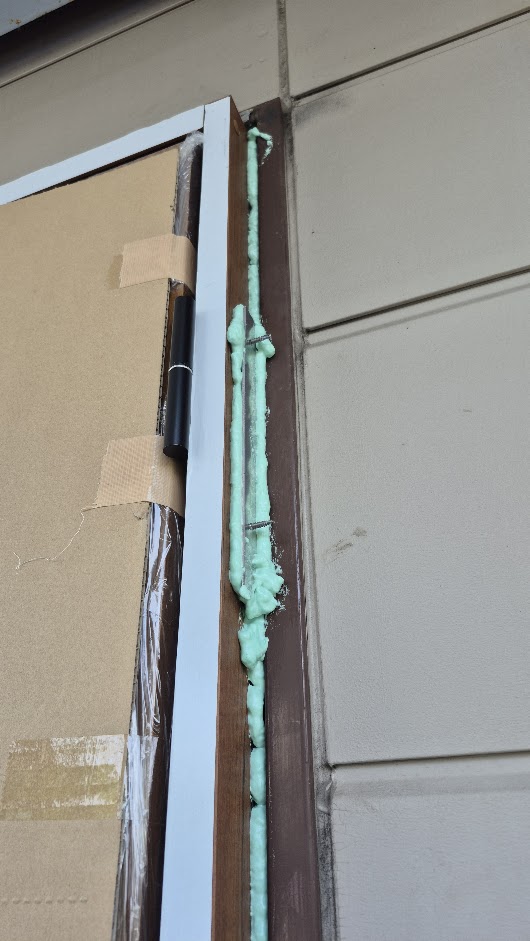 弊社では「カバー工法」を行った際、玄関ドアを取り付けた時にできてしまう新設枠と既存枠との隙間に「断熱気密施工」を施すサービスを無料で行っております。