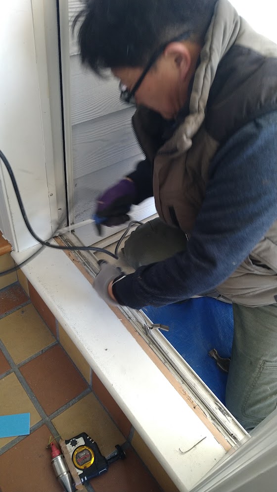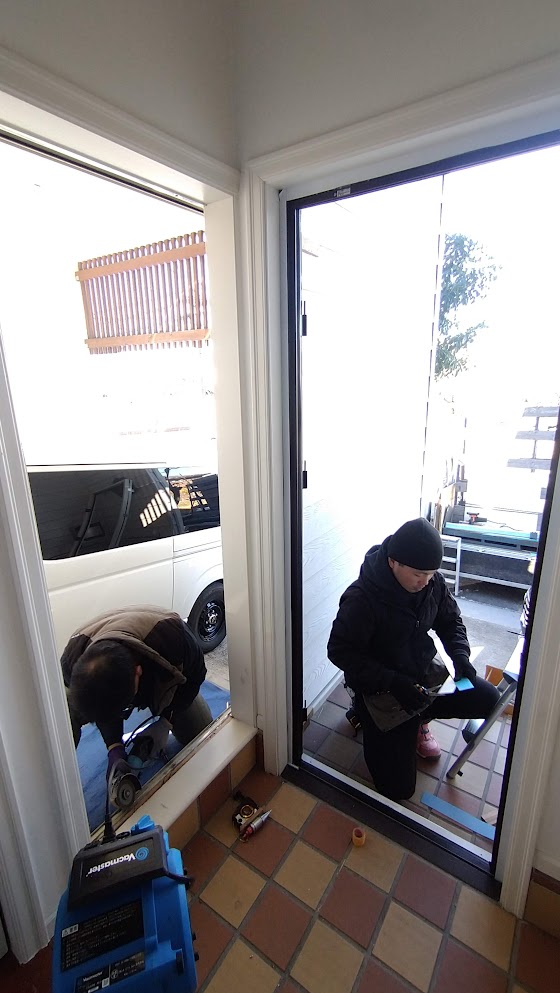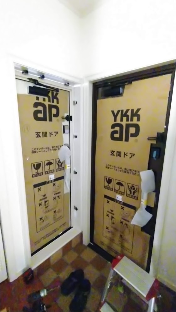 取り付け中&解体中^^玄関ドアは内付け枠仕様。